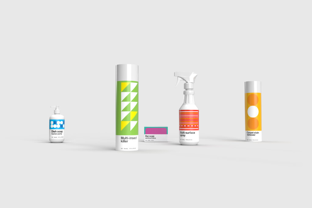 The resulting identity and packaging draws inspiration from the bright palette and bold, reductive forms of midcentury artists. Each product exterior features a distinct geometric illustration that references what’s inside: a lozenge shape for dishwashing pods, a dot-dash line pattern for multi-surface spray. On products with various scents or varieties, color is the differentiator. Monochrome type—which feels unadorned and honest—speaks to the company’s DTC ethos.